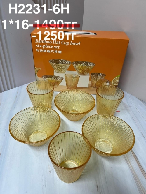 №7628 H2231-6H Набор из 6 предметов чашки и миски узор волна янтарного цвета (1к-16шт) Стакан - 265 мл х 3 шт