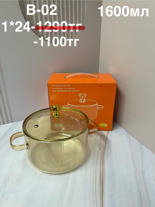 B-02 Каструлья янтарная с ручкой огнеупорная 1600 мл (1кр-24шт) 1PCS/SET